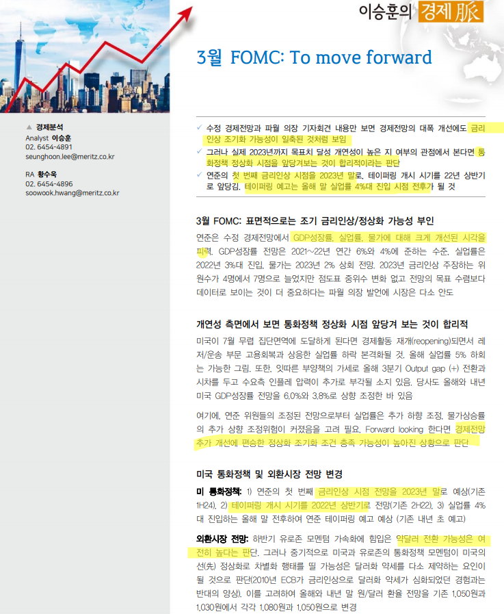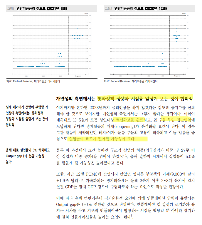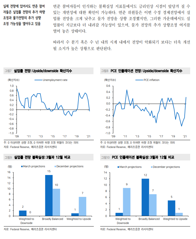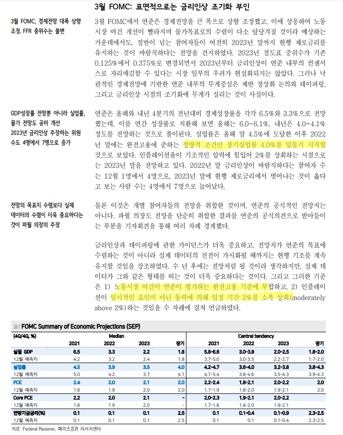 - 수정 경제전망과 파월 의장 기자회견 내용만 보면 경제전망의 대폭 개선에도 금리 인상 조기화 가능성이 일축된 것처럼 보임