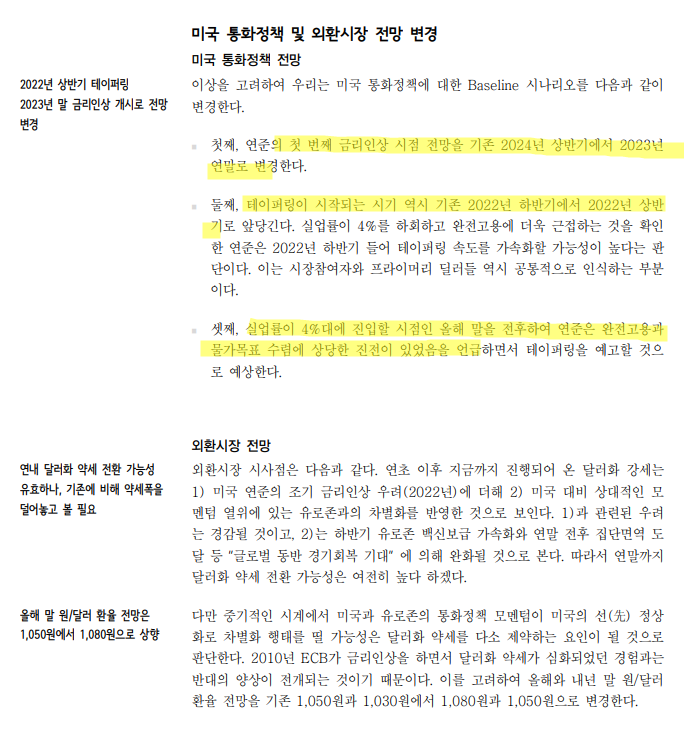 - 연준의 첫 번째 금리인상 시점을 2023년 말로, 테이퍼링 개시 시기를 22년 상반기 로 앞당김. 테이퍼링 예고는 올해 말 실업률 4%대 진입 시점 전후가 될 것