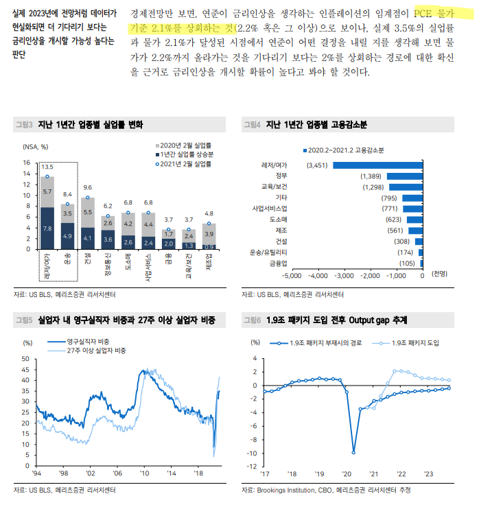 - 연준의 통화정책 기준은 실질지표인 고용률과 인플레이션임. 고용률이 완전고용에 가까워지는 4% 전후, 인플레이션율이 PCE기준 2.2%정도에 액션에 나설 것