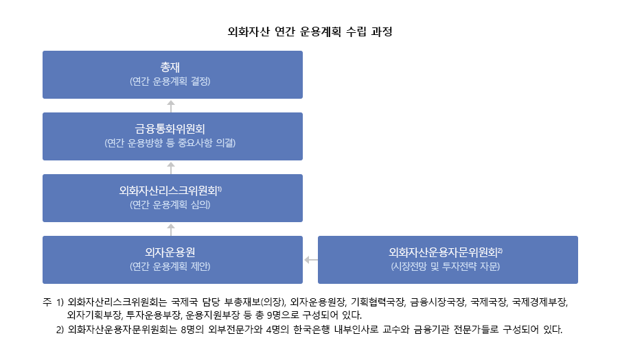 한국은행의 외화자산 운용과정은 크게 연간 운용계획 수립, 투자실행, 리스크관리 및 성과평가 등으로 이루어진다. 연간 운용계획은 외화자산 운용방향과 전략적 운용기준, 투자지침 등으로 구성된다. 동 계획은 외부 교수 및 전문가들로 구성된 외화자산운용자문위원회와 한국은행의 주요 부서장들이 참여하는 외화자산리스크위원회에서 광범위하게 의견을 수렴하고 금융통화위원회가 기본방향을 의결하는 과정을 거쳐 수립된다.