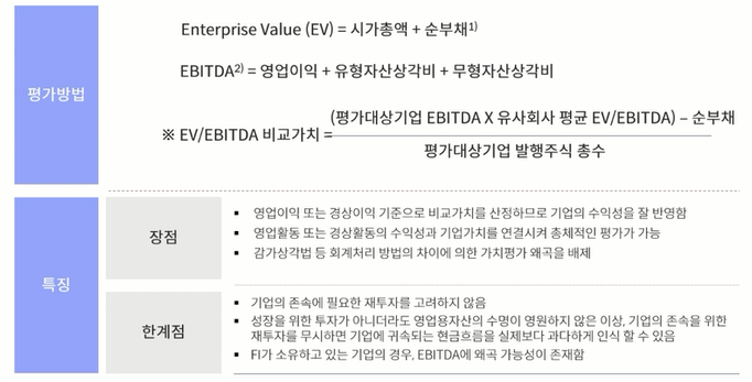 상대가치 평가방법(PER 비교, EV / EBITDA 비교, PSR 비교, PBR 비교, EV / Capacity 비교 등) 은 주식시장에 분석대상 기업과 동일하거나 유사한 제품을 주요 제품으로 하는 비교가능성이 높은 유사 기업들이 존재하고, 주식시장은 이런 기업들의 가치를 평균적으로 올바르고 적정하게 평가하고 있다는 가정하에 분석대상 기업과 비교기업을 비교, 평가하는 방법으로서 그 평가방법이 간단하고 연관성을 갖기 때문에 유용한 기업가치 평가방법으로 인정되고 있다. 그러나, 비교기업의 선정 시 평가자의 주관 개입 가능성과 시장의 오류(기업가치의 저평가 혹은 고평가)로 인한 기업가치 평가의 오류 발생 가능성은 여전히 상대가치 평가방법의 한계점으로 지적되고 있다.