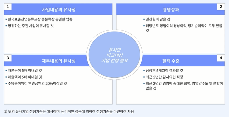 위의 지표를 활용하여 타겟과 비교대상 멀티플 群 이 적당한 멀티플인지, 아니면 할인 및 할증이 필요하지는 않을지 고려해야 합니다.