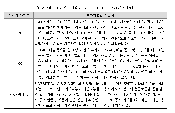네오팩트라는 회사가 상장할 때 공시되었던 주가 평가 기준에 대한 설명을 케이스스터디로 다루어 볼까한다. 증권신고서는 금융시장에서 회사의 가치를 어떻게 평가하는지 알수 있는 매우 유용한 자료다. 평가대상회사가 어떤 비율을 적용할지 투자설명서에 이유가 상세하게 정리되어 있다. 사례 기업은 PER를 적용하는 평가방법을 사용했고, 아래는 선정 이유이다. PER는 수익성을 잘 반영하고 있고, 성장성, 위험 등을 반영하고 있어서 적합하다는 의미이다.