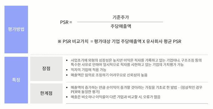 PSR에서 사용되는 매출액은 당기순이익이나 영업이익에 비해 매우 클리어하므로 신뢰도가 높은 지표라고 할 수 있으며, 적자기업에 대해서도 가치평가가 가능하다는 장점이 있다. 그러나, 매출액이 증가하는 만큼 순이익이 증가할 거라는 가정을 기초로 하고 있기 때문에 논리적 결함이 존재한다.