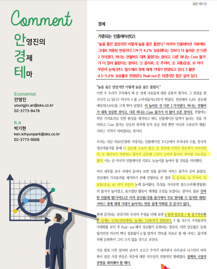 | 210528 전략공감: 지금의 인플레이션의 원인은 고용/수출율/이전소득에 의한 변수 영향, 구조적 인플레이션은 아니므로 22년 상반기쯤 정상화 될 것, 신경제에서 요구되는 원자재의 가격 상승, .. (0) |