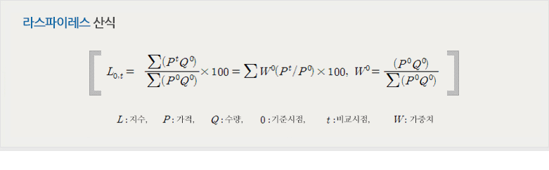 라스파이레스 산식은 기준시점의 가중치를 사용한 가격비율의 가중산술평균으로 정의됩니다.