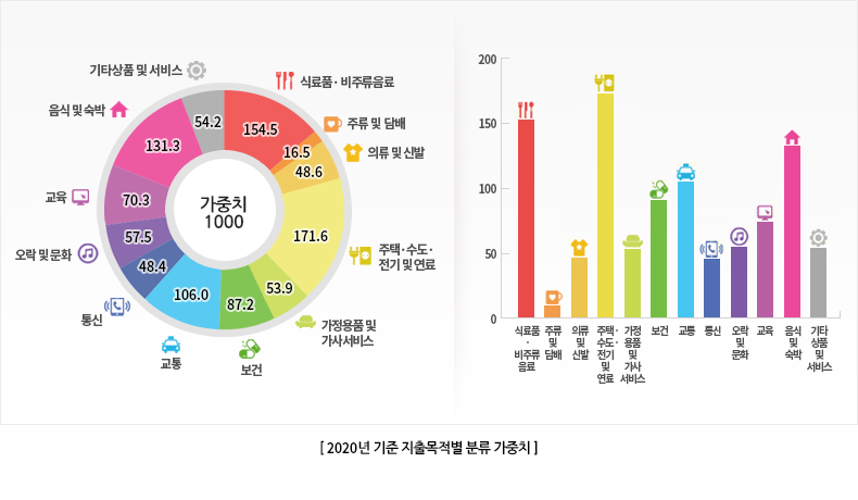 가중치는 통계청의 “가계동향조사”에서 나오는 우리나라 가구의 소비지출구조에서 얻어집니다.