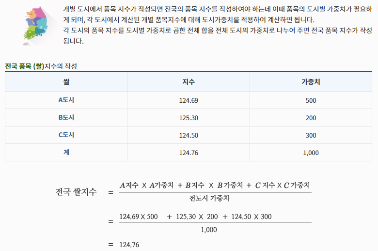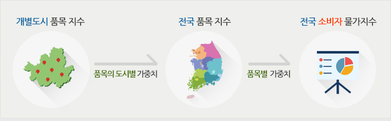 도시별로 품목 지수(비교시점 가격/기준시점 가격)를 먼저 작성하고 각 품목의 도시별 가중치를 적용하여 전국 품목 지수를 작성합니다. 그 다음 전국의 품목 지수에 품목별 가중치를 적용하여 전국 소비자 물가지수를 산출합니다.