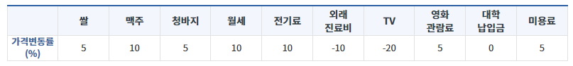 각 품목별로 평균가격을 계산하여 지난달과의 가격변동률을 계산하는데 이 나라의 품목별가격 변동률은 다음과 같이 조사되었습니다.