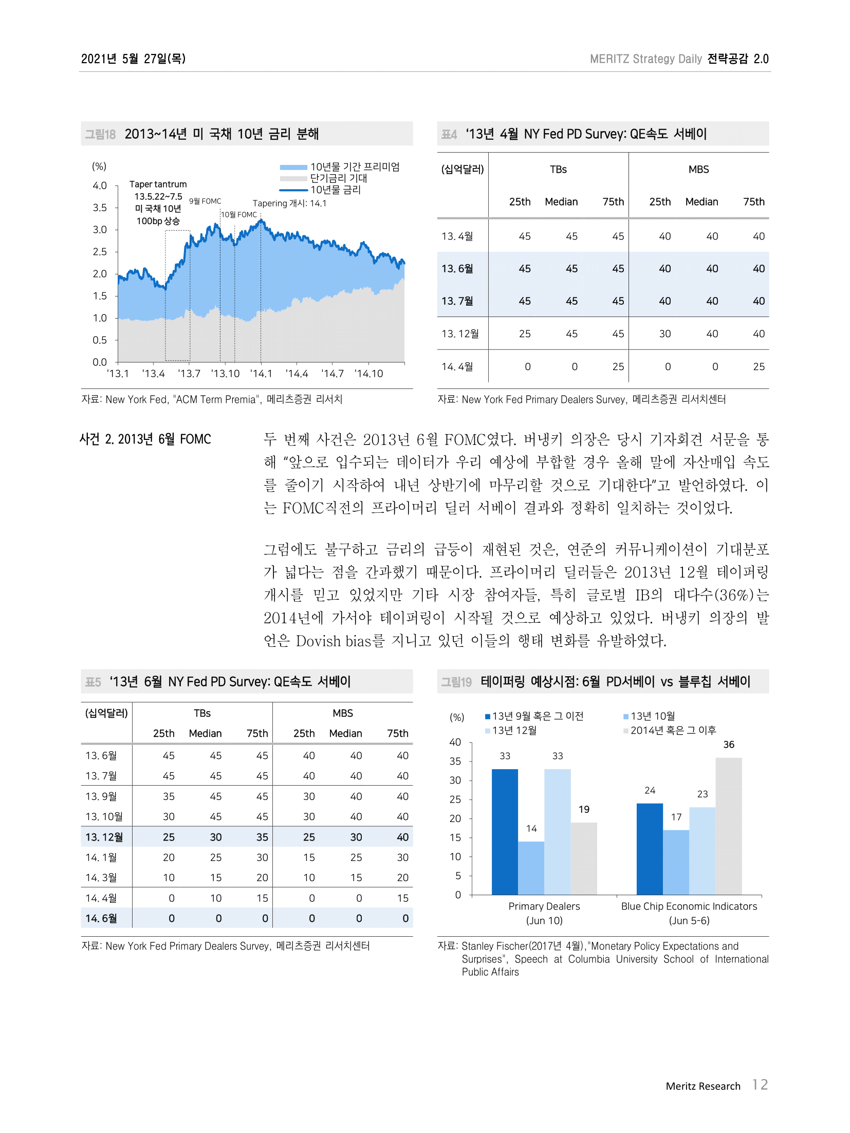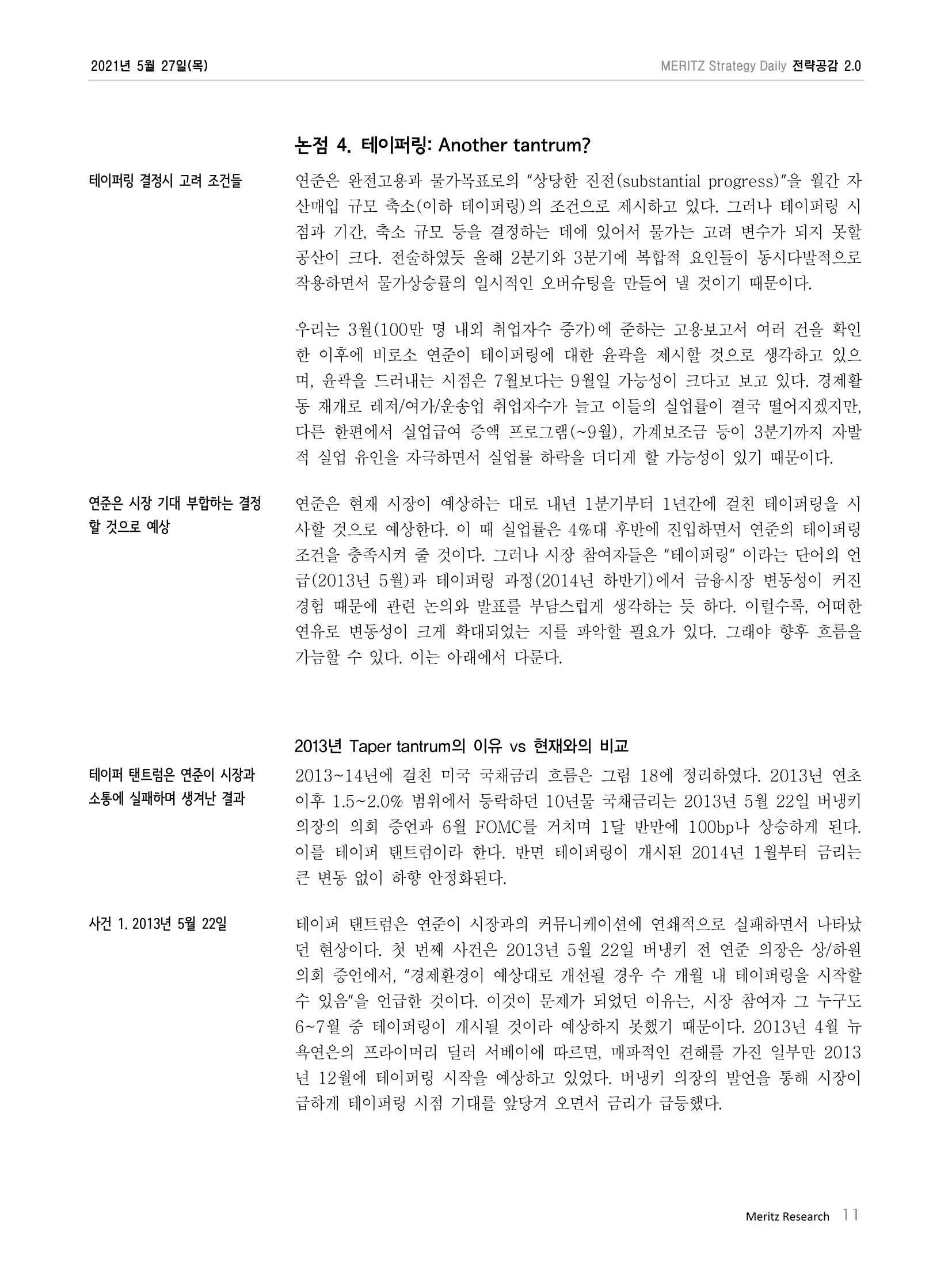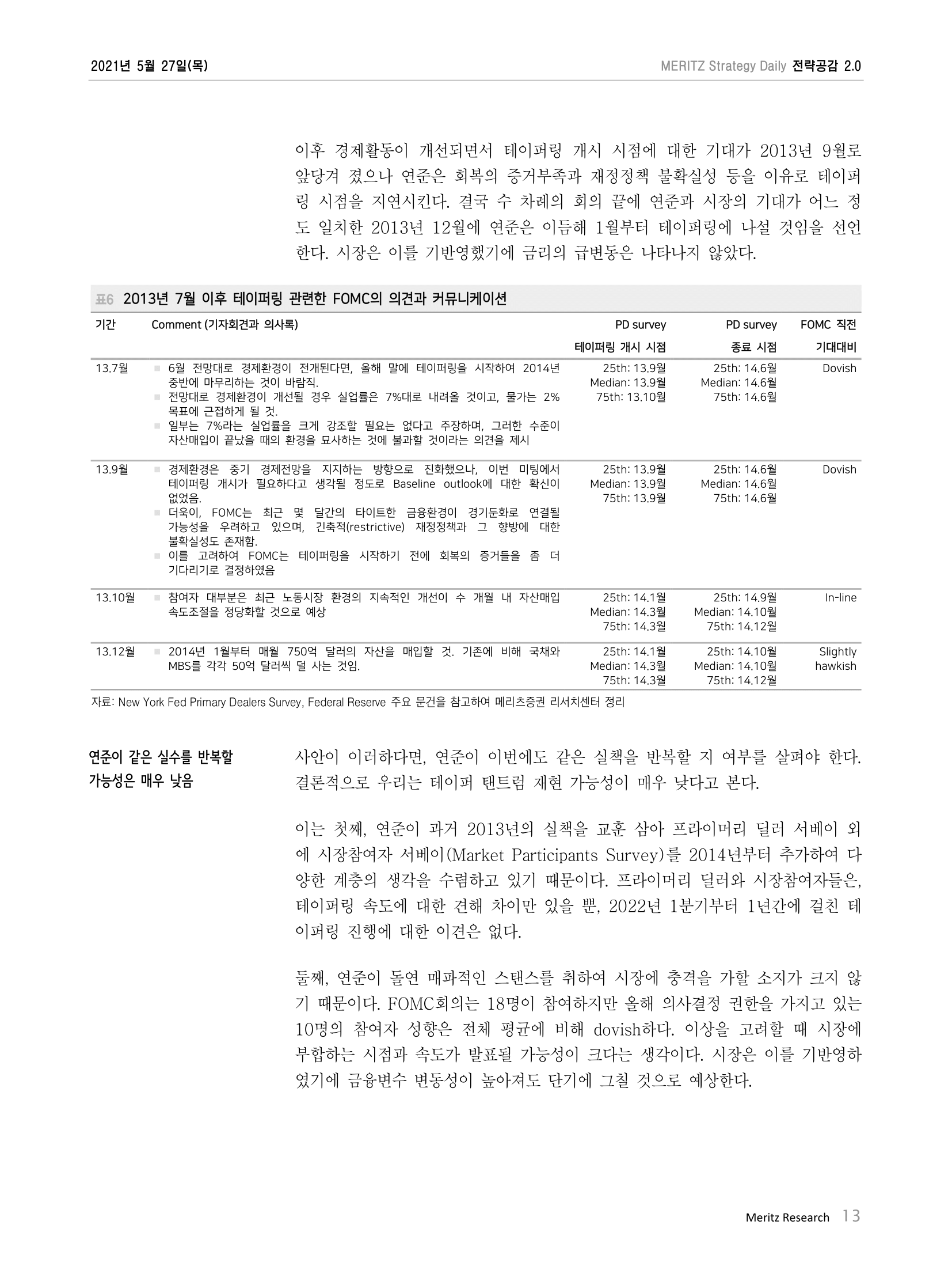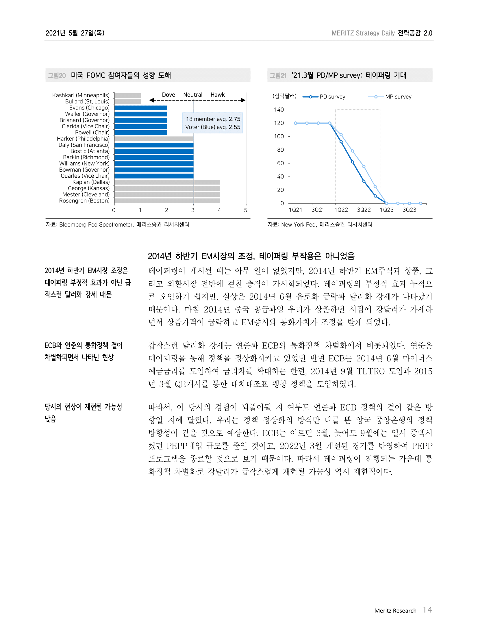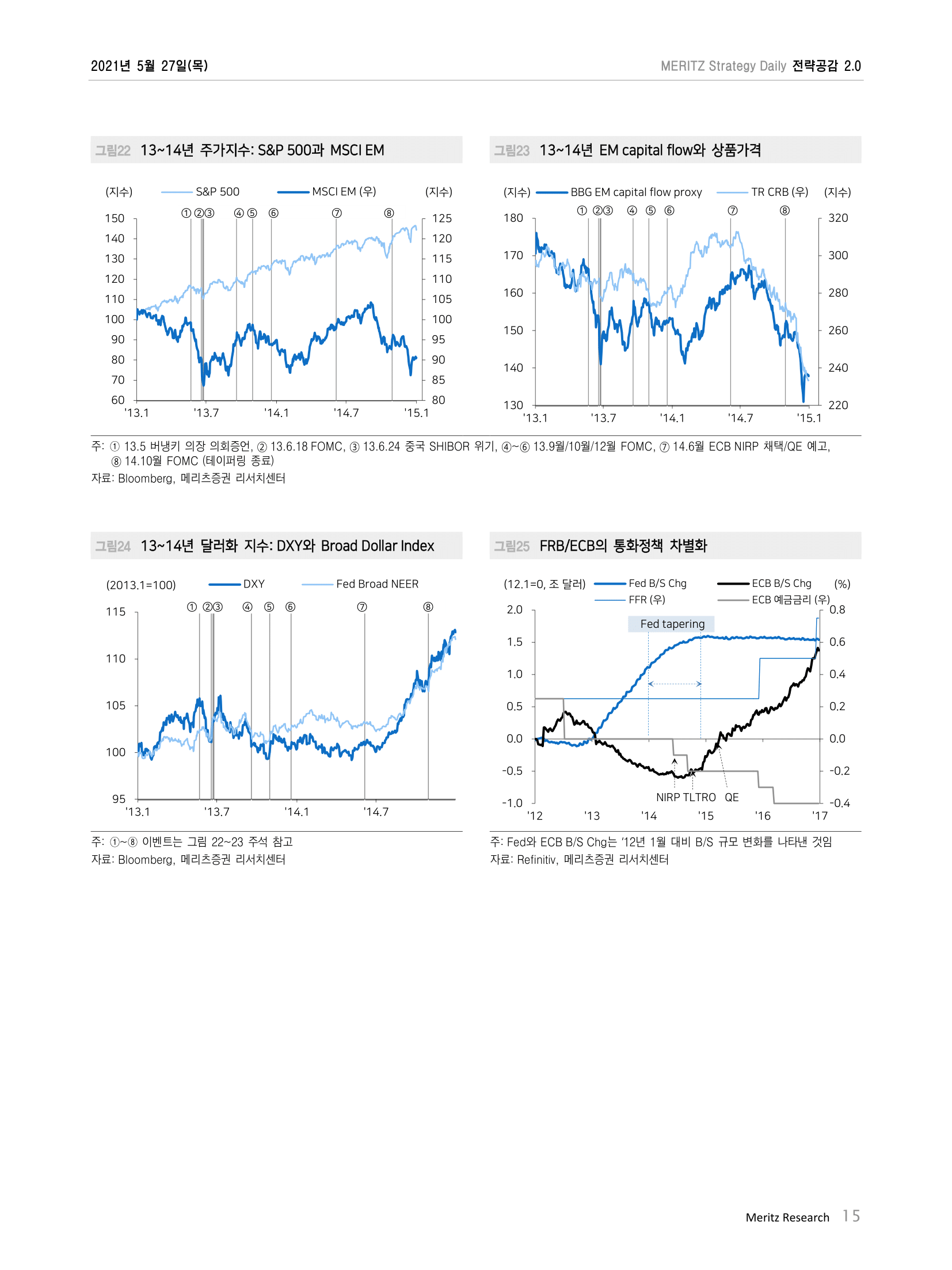 넷째, 테이퍼링은 불편한 이슈지만, 연준은 2013년의 같은 실수를 되풀이하지 않을 가능성이 매우 높다. 시장의 기대변화를 면밀히 모니터링하면서 정책결정 을 하기 때문이다. 투자자들은 2014년 하반기 EM시장 조정을 우려하지만 이 는 통화정책 차별화 때문이지 테이퍼링이 직접적 이유는 아니었다. ECB와 연 준은 정상화의 방식만 다를 뿐, 점진적 정상화로 이행하고 있기에 갑작스런 달러 강세가 진행될 가능성 역시 낮다.