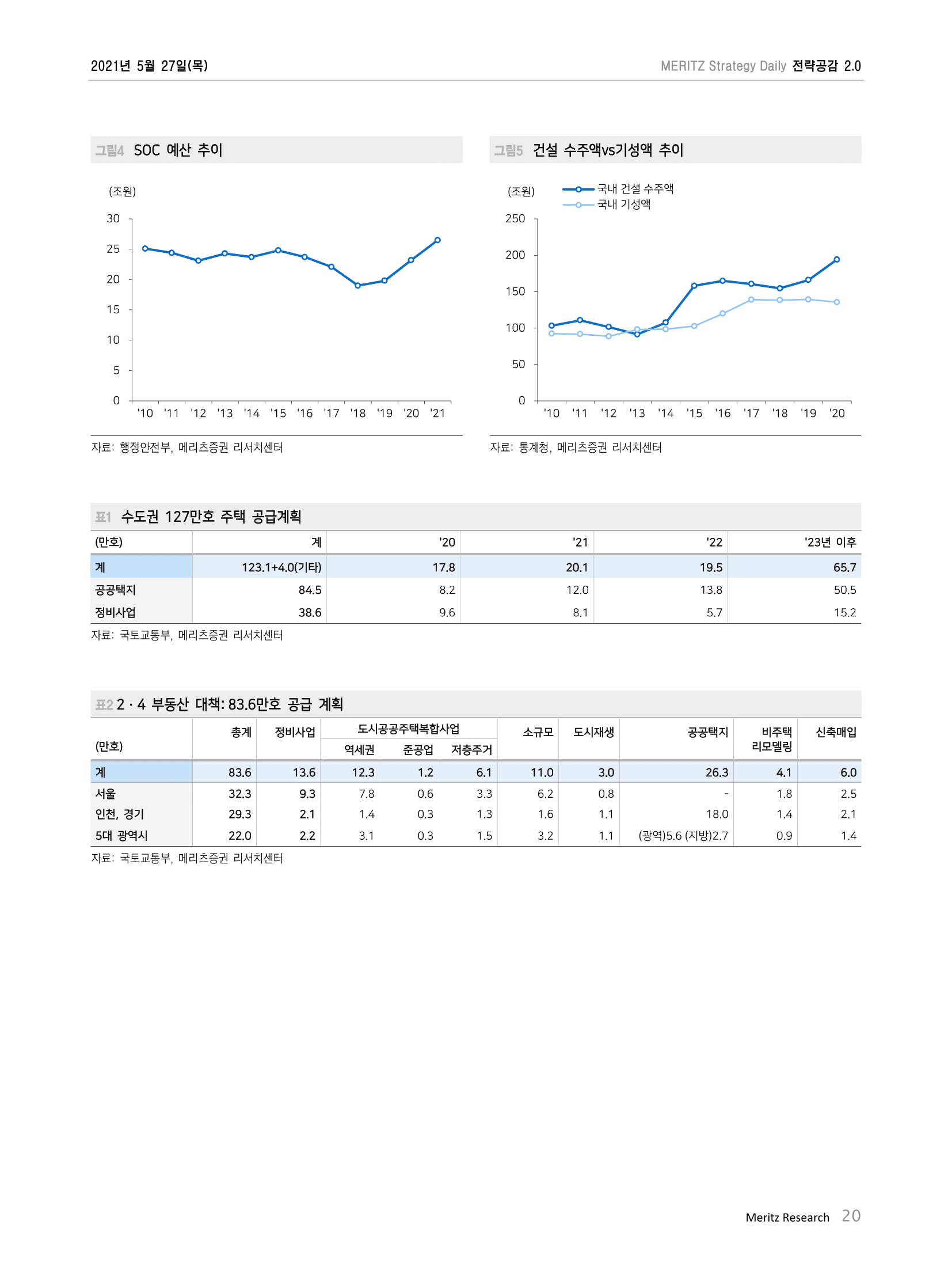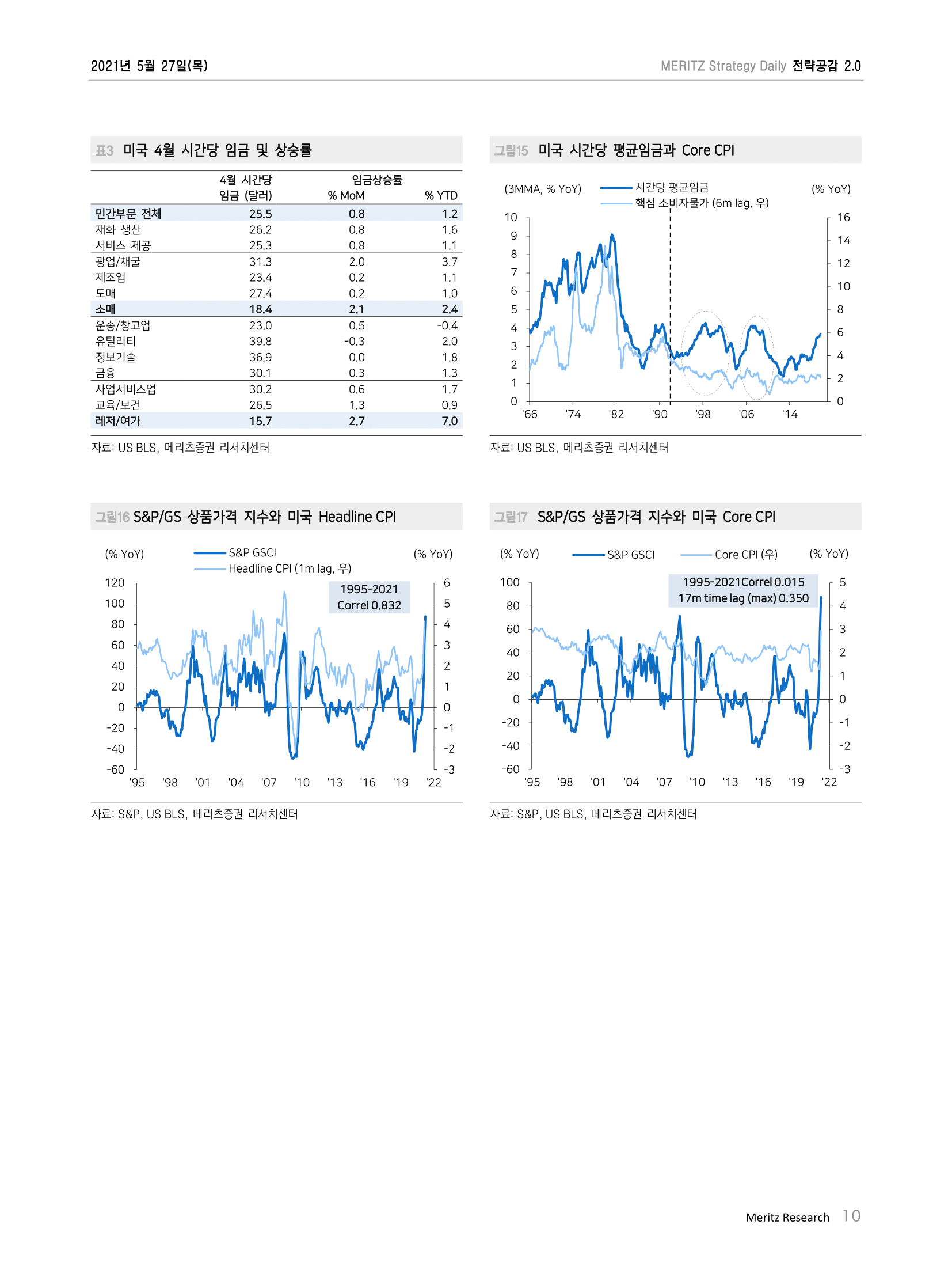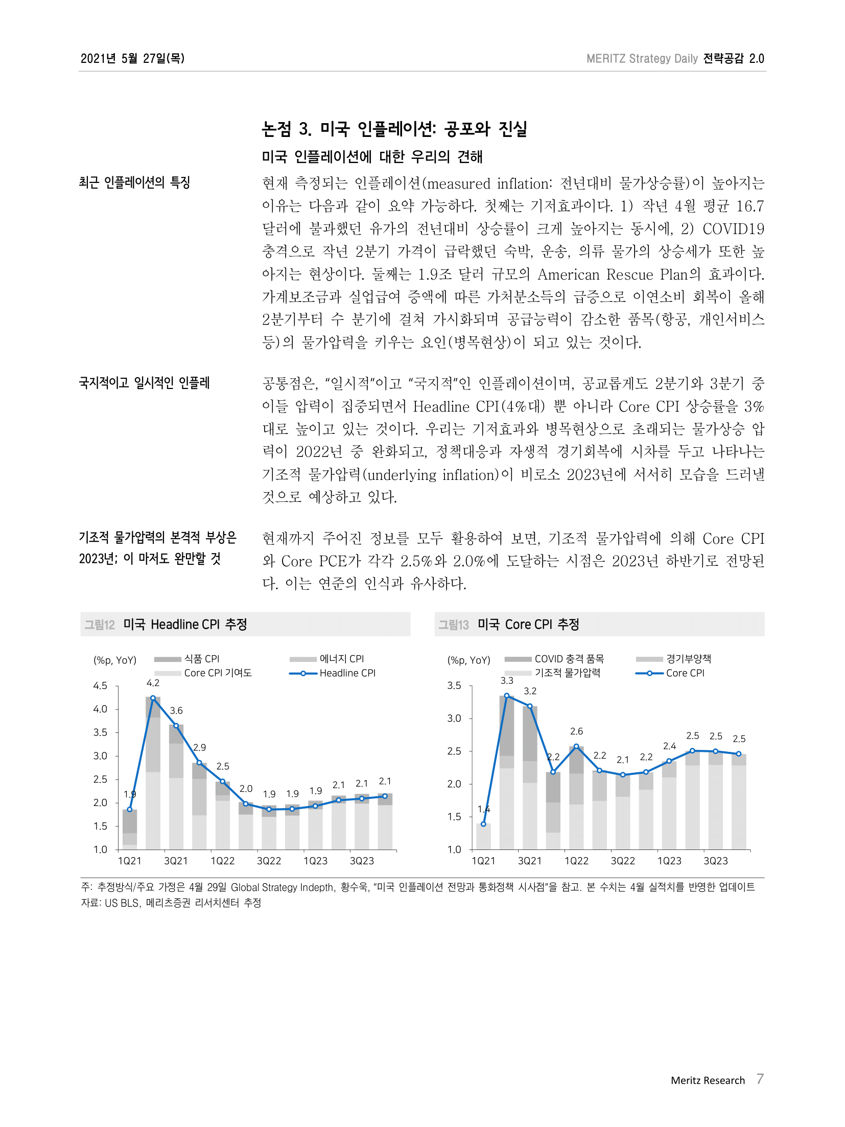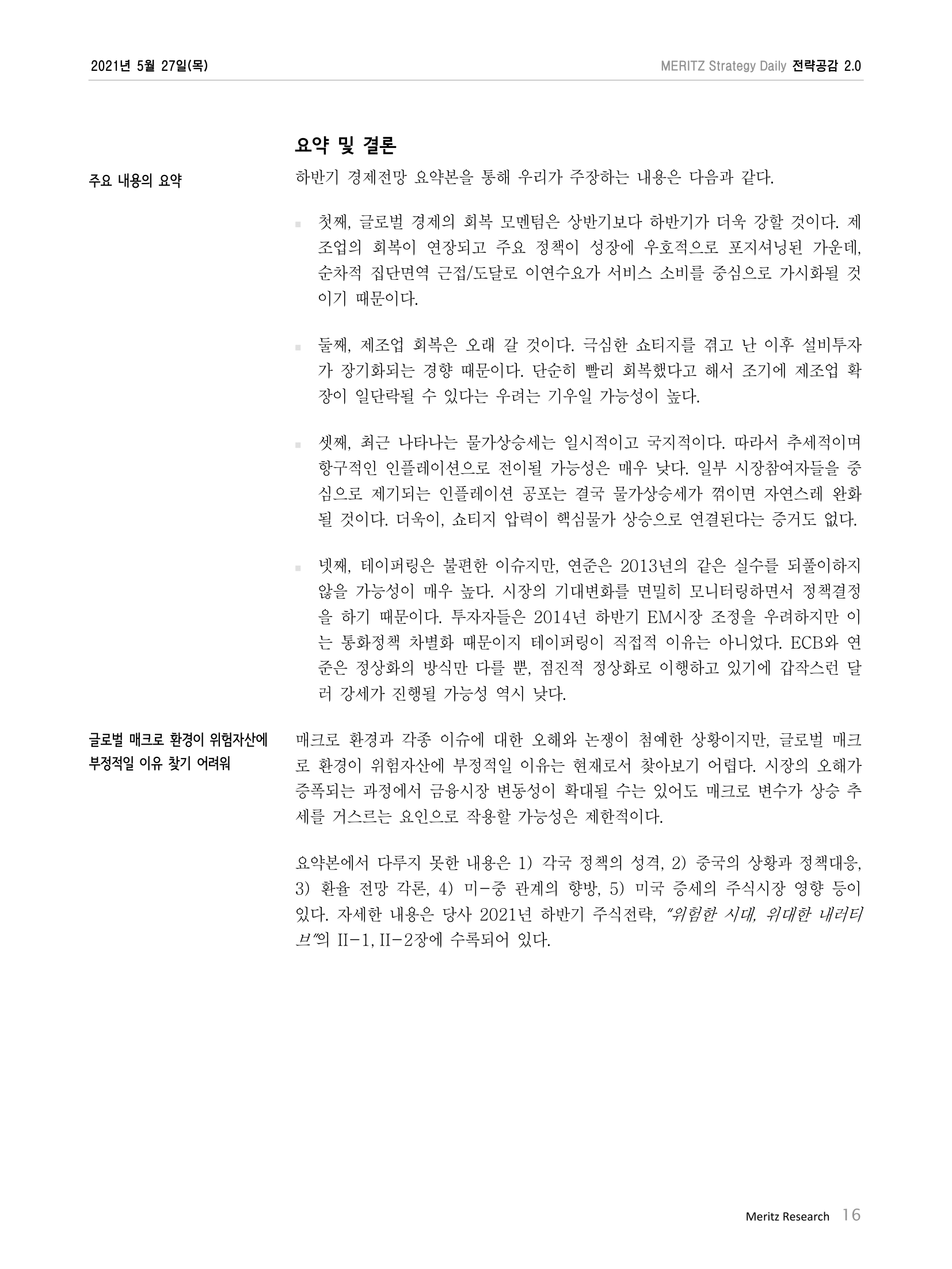 매크로 환경과 각종 이슈에 대한 오해와 논쟁이 첨예한 상황이지만, 글로벌 매크 로 환경이 위험자산에 부정적일 이유는 현재로서 찾아보기 어렵다. 시장의 오해가 증폭되는 과정에서 금융시장 변동성이 확대될 수는 있어도 매크로 변수가 상승 추 세를 거스르는 요인으로 작용할 가능성은 제한적이다. 요약본에서 다루지 못한 내용은 1) 각국 정책의 성격, 2) 중국의 상황과 정책대응, 3) 환율 전망 각론, 4) 미-중 관계의 향방, 5) 미국 증세의 주식시장 영향 등이 있다. 자세한 내용은 당사 2021년 하반기 주식전략, “위험한 시대, 위대한 내러티브”의 II-1, II-2장에 수록되어 있다.