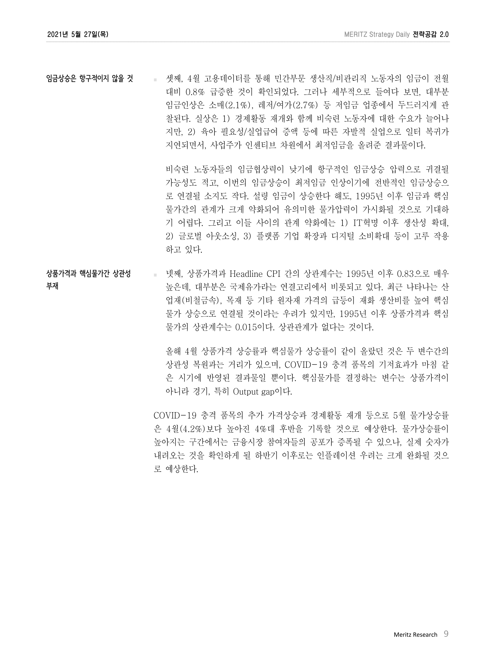 셋째, 최근 나타나는 물가상승세는 일시적이고 국지적이다. 따라서 추세적이며 항구적인 인플레이션으로 전이될 가능성은 매우 낮다. 일부 시장참여자들을 중 심으로 제기되는 인플레이션 공포는 결국 물가상승세가 꺾이면 자연스레 완화 될 것이다. 더욱이, 쇼티지 압력이 핵심물가 상승으로 연결된다는 증거도 없다.