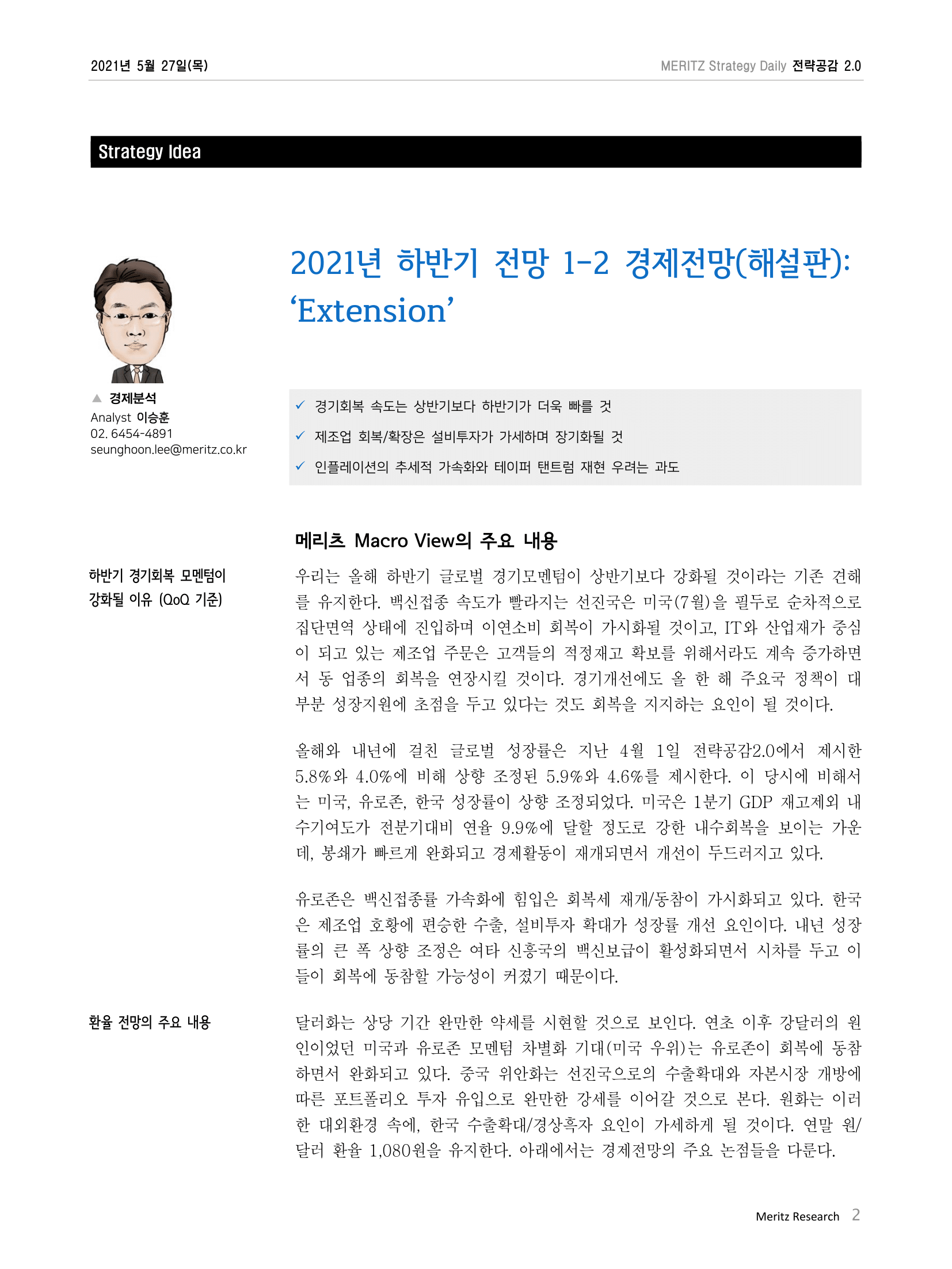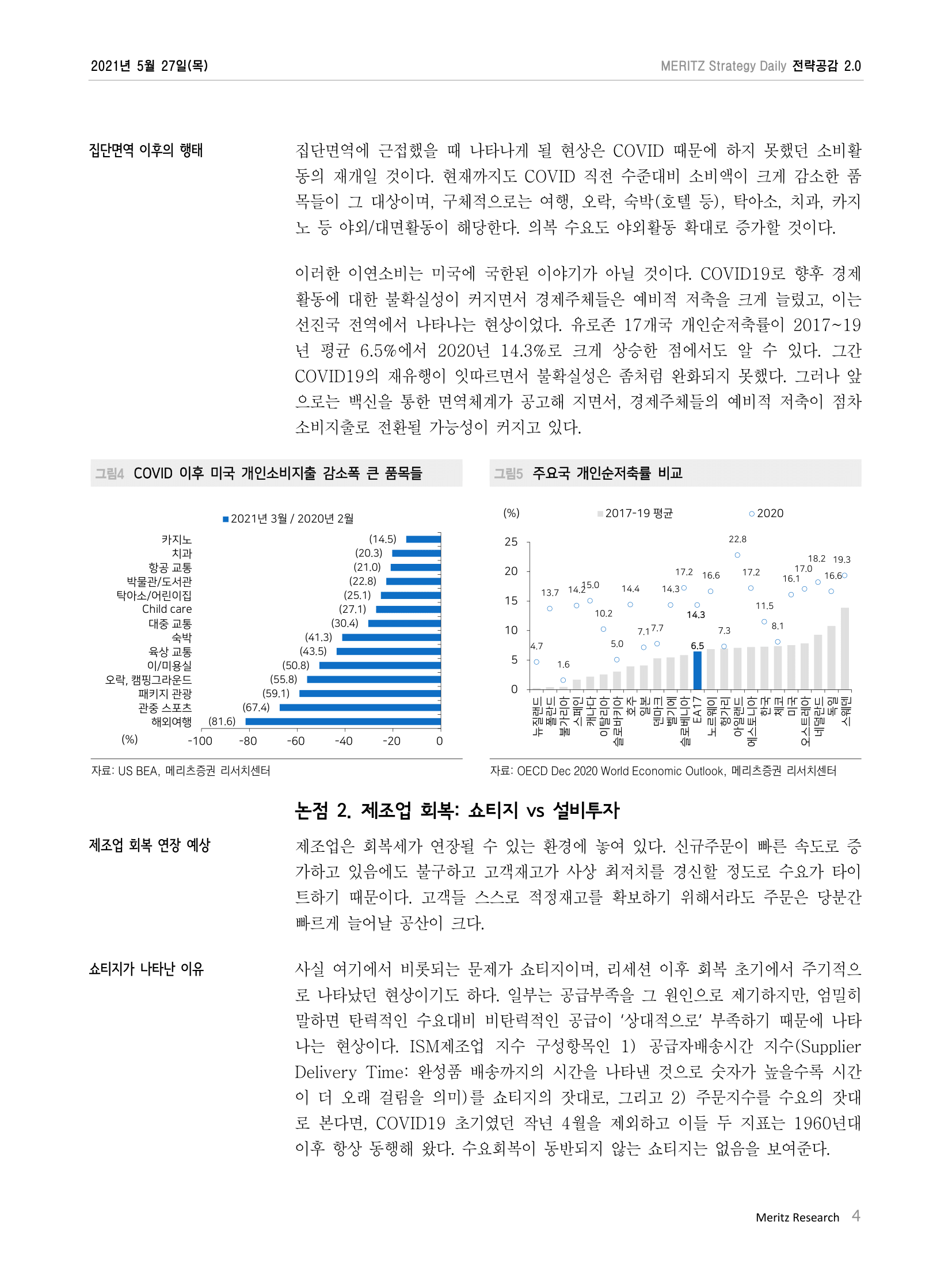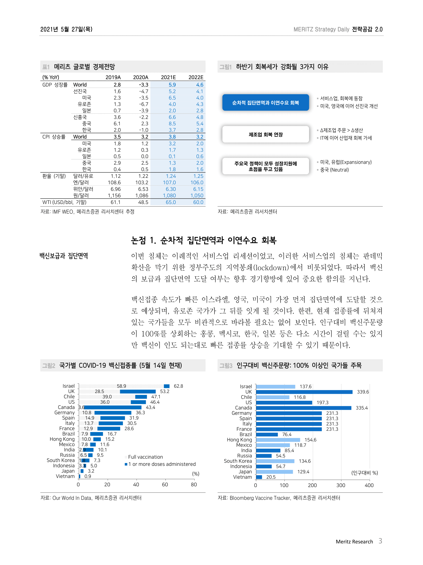 첫째, 글로벌 경제의 회복 모멘텀은 상반기보다 하반기가 더욱 강할 것이다. 제조업의 회복이 연장되고 주요 정책이 성장에 우호적으로 포지셔닝된 가운데, 순차적 집단면역 근접/도달로 이연수요가 서비스 소비를 중심으로 가시화될 것 이기 때문이다.
