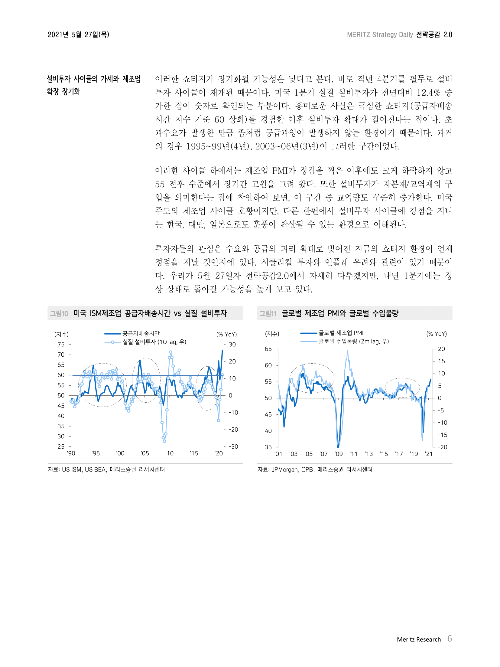 둘째, 제조업 회복은 오래 갈 것이다. 극심한 쇼티지를 겪고 난 이후 설비투자 가 장기화되는 경향 때문이다. 단순히 빨리 회복했다고 해서 조기에 제조업 확 장이 일단락될 수 있다는 우려는 기우일 가능성이 높다.