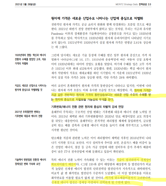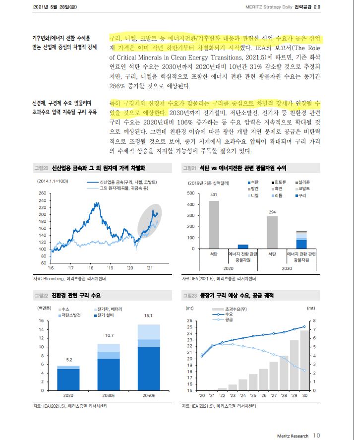 - ESG와 맞물려 새로운 산업에서 요구되는 리튬 구리 코발트와 같은 원자재는 지속적인 물가상승이 이어질 것