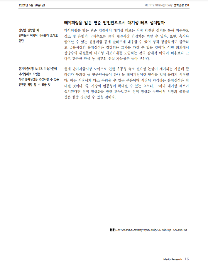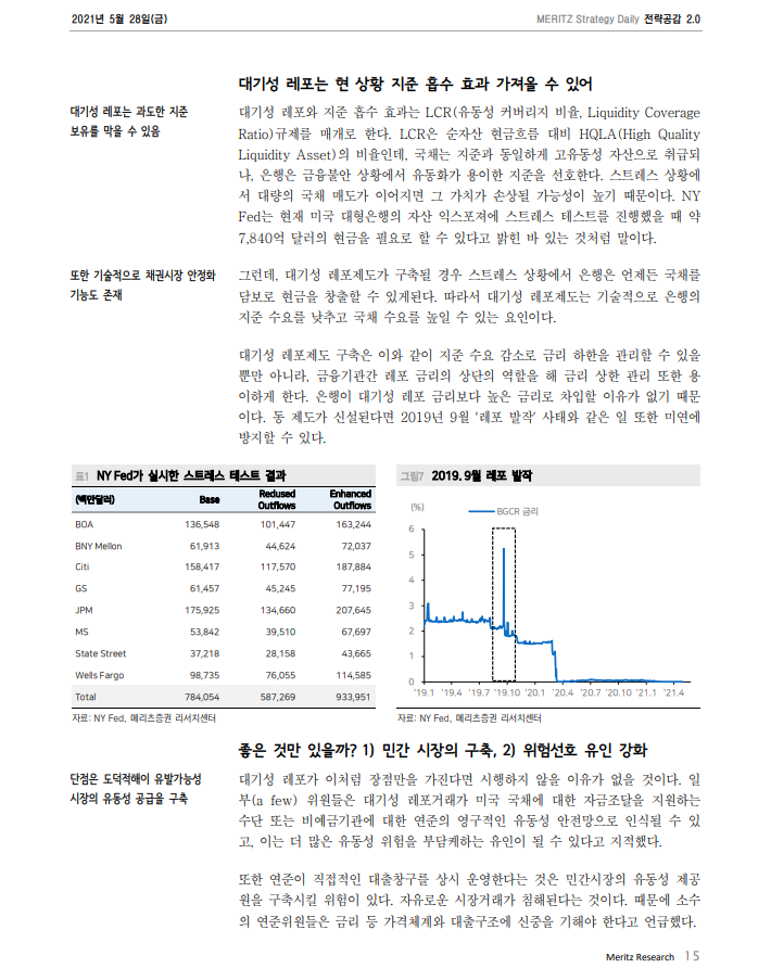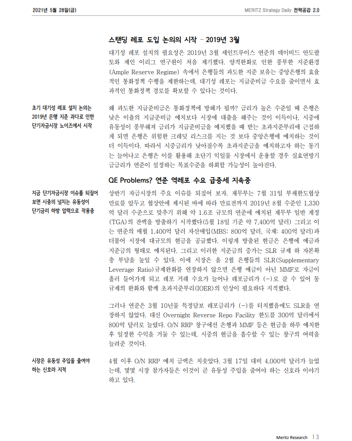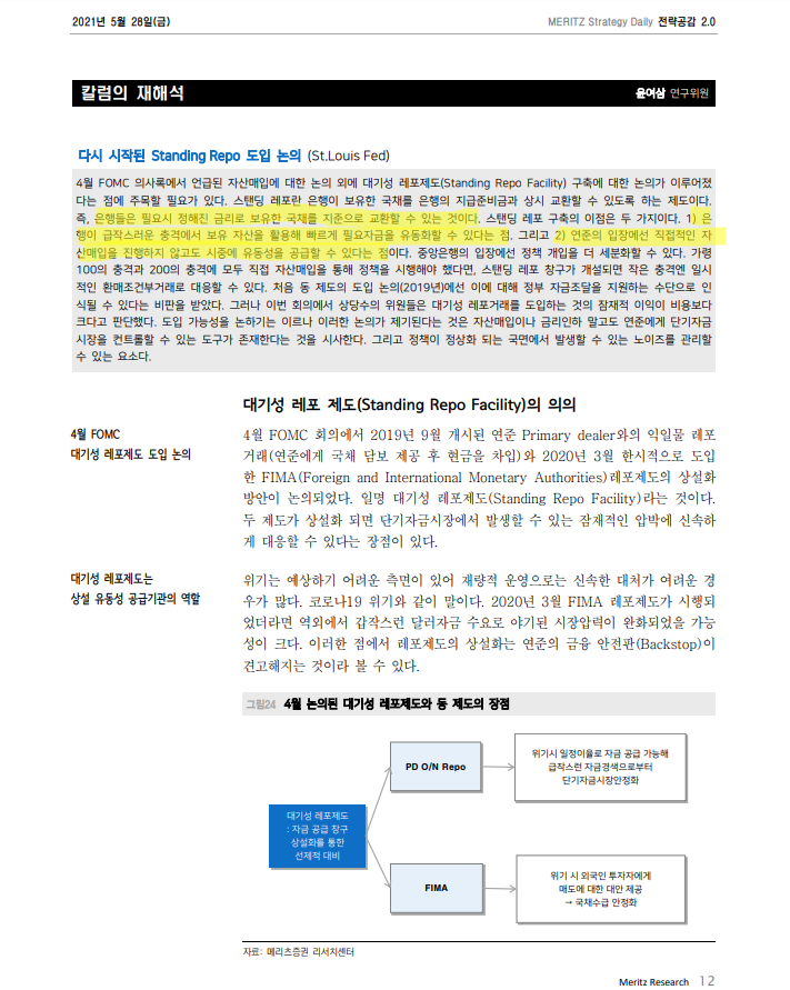 - 이에 대한 대응책으로 연준이 경제주체가 들고있는 국채를 담보로 돈을 대출해 현금을 융통하는데 이를 스탠딩 레포라고 한다.