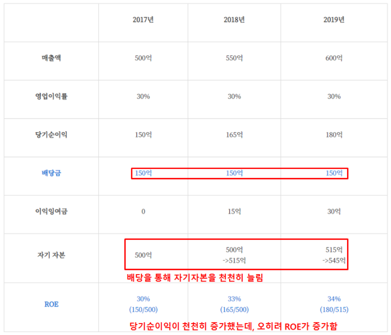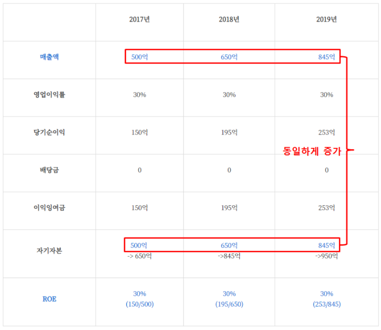 위에서 보여드린 예시가 첫째에 해당됩니다. 두 번째 방법인 분모인 자본을 천천히 늘리는 방법을 예시를 통해 보여드리겠습니다.자본을 천천히 늘리는 방법은 배당을 통해서 가능한데요. 당기순이익에서 배당을 하고 남은 금액이 이익잉여금(자본)으로 쌓이게 됩니다.아래 예시에서는 똑같이 영업이익률이 30%지만, 매출액이 더 조금 증가합니다. 하지만 자본을 천천히 늘리는 경우 ROE가 더 높아지는 것을 볼 수 있습니다.