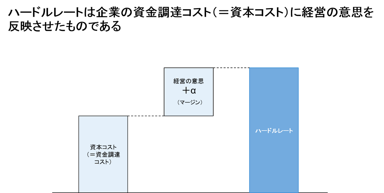 여기서 Hurdle rate이라고 하는 개념에 대해 설명을 해 두고 싶다고 생각합니다.이 Hurdle rate은 기업의 자금조달비용인 WACC에 경영의사를 반영한 것이라 할 수 있습니다.