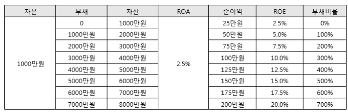 위 표에서 볼 수 있듯이 부채가 많아질수록 ROE가 높아지게 된다. 하지만 부채를 많이 끌어다 쓸수록 사업의 위험성은 커지게 마련이다. 예상대로 사업이 잘 되지 않으면 은행 대출금을 제대로 못 갚게 되어 파산에 이를 수도 있다. 더군다나 은행에서 위의 예시처럼 자기자본의 7배나 되는 대출금을 빌려주리 만무하다. 즉, 경영자라면 ROE를 끌어올리기 위해서 부채비율을 올리기 보다는 본업의 수익성을 증가시킴으로써 ROE를 높여야 하는 것이다. 다시 말해, ROA를 높여야 한다는 말이다. 단, 금융업의 경우 업의 특성 상 부채를 끌어들이는 것이 핵심 경쟁력 중 하나이기 때문에 부채비율이 높고 ROA가 낮은 특성이 있다. 또한 금융업이 아닌 경우에도 무차입보다는 적정 수준의 부채를 사용하여 사업을 꾸려나가는 것이 주주이익 극대화에 도움이 된다. 그래도 경영자의 제1의 책무는 본업의 수익성(ROA)을 높이는 것이다.