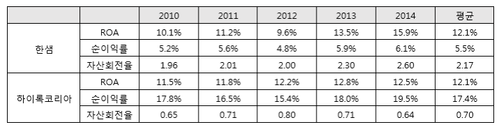 한샘은 부엌가구 제조 및 유통시장의 강자이고, 하이록코리아는 산업용 피팅, 밸브시장의 선도기업이다. 두 회사의 ROA는 12%로 비슷한 수준이나 그 내용을 뜯어보면 두 회사 사업 성격의 차이를 확인할 수 있다. 한샘의 경우 제품 하나 당 마진율이 5.5% 수준으로 낮은 대신 총자산의 두 배 이상의 매출액을 올림으로써 박리다매 구조를 가지고 있다. 반면, 하이록코리아는 총자산 대비 70%의 매출액밖에 올리지 못하지만 대신 마진율을 높임으로써 후리소매의 수익구조를 가지고 있는 것을 볼 수 있다. 둘 중 어느 것이 낫다고 할 수 없다. 이익률을 높이던지 (재고)자산을 더 빠르게 회전시키던지 결정하는 것은 경영진의 몫이다.