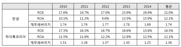 두 기업 모두 ROA는 12%로 비슷한 상황이지만 ROE에서 상당 부분 차이가 나는 것을 알 수 있다. 그 원인은 재무레버리지 때문인데, 하이록코리아는 36%의 적은 부채비율을 가지고 있지만 한샘의 경우 74%의 상대적으로 높은 부채비율로 인해 ROE도 4.5%포인트 높은 결과가 나오는 것이다. (재무레버리지에서 1을 빼면 부채비율이다.) 일단 두 기업 모두 100% 이하의 부채비율을 가지고 있기 때문에 재무 안정성은 튼튼하다고 볼 수 있다.