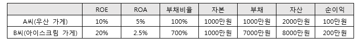 명칭과 공식에서도 알 수 있듯이 ROE가 자본의 효율성을 나타내는 것이라면, ROA는 자산의 효율성을 알려준다. 비교를 위해 B씨가 차린 아이스크림 가게를 살펴보자. B씨 역시 A씨와 동일하게 1000만원의 자본을 가지고 사업을 시작하려고 한다. 그런데 B씨는 공격적인 성격의 사업가로 대출금을 왕창 빌려 더 큰 수익을 벌어들일 계획을 가지고 있다. 결국 은행에서 7000만원을 빌린 B씨는 자기자본 1000만원을 합쳐 총자본 8000만원으로 아이스크림 가게를 시작했다. 공격적인 의사결정의 결과대로 A씨가 100만원을 벌어들인 것보다 2배의 수익인 200만원을 벌어들이게 되었다. 이제 수익성 분석을 해 보자. 먼저, ROE를 구해보면, 200만원/1000만원=20%이다. A씨가 기록한 10%보다 2배 높은 수익률을 기록했으니 잘 했다고 볼 수 있다. ROA를 배웠으니 이 수치도 구해보자. 아이스크림 가게의 ROA는 200만원/8000만원=2.5%이다. ROA를 비교했을 때는 A씨의 5%보다 낮은 수익률이다.