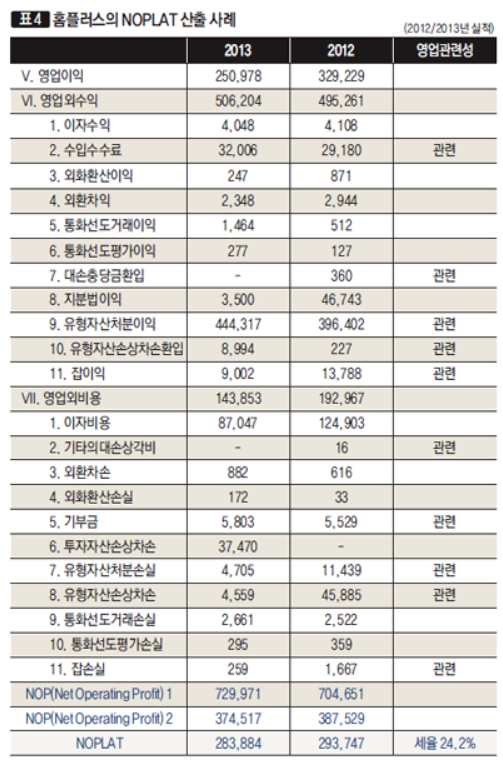 첫째, 이자수익은 대부분 영업활동과 무관한 잉여자금에서 창출됐다고 판단된다. <표 5>에서 알 수 있듯이 2012년의 현금 및 현금성 자산은 139억 원이고 2013년에는 1966억 원으로 증가했는데 2013년의 수치가 비정상적인 수치로 판단되므로 이자수익은 대부분 영업과 무관한 여유자금에서 창출된 것임을 알 수 있다. 물론 2012년 잔액인 139억 원이 적정한 수준의 필수 현금성 자산이라고 추정되고 여기서 창출된 수입이자는 NOP에 포함할 수 있으나 금액이 크지 않아 자세한 분석은 생략했다. 둘째, 지분법 이익은 영업과 무관한 투자자산에서 발생하는 수익이므로 제외했다. 셋째, 외환 관련 손익이나 통화선도거래 관련 손익은 영업과 관련 없이 재무적 리스크와 관련한 손익이므로 제외했다.