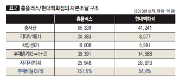 <표 2>에서 홈플러스는 부채비율이 약 152%이나 부채의 구성을 보면 조달비용이 발생하지 않는 기타 부채가 52%고 이자비용이 발생하는 차입금은 48%로 오히려 기타부채보다 적다. 현대백화점 역시 기타부채가 차입금을 초과한다. 기타부채는 회사의 사업모델에 따라 많이 좌우된다. 어떤 회사는 현금 결제를 선호해 매입채무가 적은 반면 어떤 회사는 장기어음으로 결제해 매입채무가 커지기도 한다. 차입금을 제외한 기타부채는 조달비용이 발생하지 않으므로 투자라고 할 수 없고 따라서 총자산을 분모로 사용하는 ROA는 투자수익률이라고 하기에는 적합하지 않다.