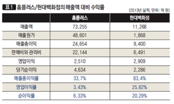 특히 매출액 대비 순이익률 지표에는 매출액 대비 경상이익률과 비교해 추가적인 문제가 있다. 바로 당기순이익에 비경상적 항목이 반영돼 수익성을 왜곡시킬 수 있다는 점이다. <표 1>에서 홈플러스의 영업이익은 2510억 원인 반면 순이익은 영업이익보다 큰 4634억 원인데 이는 2013년 중 점포 4개를 매각해 발생한 유형자산 처분이익이 4400억 원을 넘기 때문이다.
