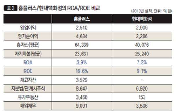 둘째, 순이익에는 영업활동과 무관한 수익이나 비용항목이 포함되고 경우에 따라서는 비경상적인 항목이 포함되기도 한다. <표 3>에서 홈플러스의 당기순이익에는 유형자산 처분이익 4400억 원이 포함돼 있어 ROE가 상승한 것이므로 지속가능한 수익률로 보기는 어렵다.