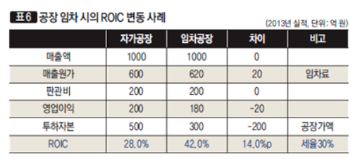 첫째, 자산을 취득하지 않고 임차하는 방법이다. 설비를 리스한다거나 부동산을 취득하지 않고 임차하는 방식이다. 국내에 진출한 일본계 호텔인 토요코인은 모든 호텔 건물을 임차해 운영한다. 호텔 건물을 취득하려면 막대한 자금이 필요하지만 임차하면 상대적으로 적은 투자비로 사업이 가능하고 ROIC를 높일 수 있다. <표 6>의 사례를 보면 연간 20억 원의 비용으로 200억 원 시가의 공장을 임차할 경우 공장 가격 대비 임대료율이 10%에 달하지만 ROIC는 공장을 임차할 때가 자가 공장인 경우보다 14%p 높아지게 된다. 이러한 현상은 사업을 통한 수익이 공장 보유에 따른 임대수익률보다 높기 때문이며 부동산을 임차하는 경우도 동일한 논리가 적용될 수 있다. 한국의 경우 과거에는 부동산 보유로 막대한 시세 차익을 얻는 경우가 많았기 때문에 자가 부동산으로 사업하는 것이 보편화됐지만 지금처럼 부동산 시세 차익의 가능성이 줄어든 경제상황에서는 자가 부동산을 통한 사업보다는 부동산 임차를 통한 사업모델이 더욱 높은 투자수익률을 가져다줄 것이다.
