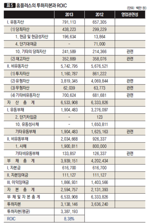 첫째, 현금 및 현금성 자산과 단기 대여금은 영업과 무관한 자산으로 분류했다. 현금 및 현금성 자산의 일부는 영업에 필수적인 자산이라고 할 수 있으나 금액이 크지 않다고 판단해 편의상 전액 영업과 관련이 없다고 봤다. 단기 대여금은 계열사에 대한 대여금으로 영업활동과 무관하다. 둘째, 투자자산은 앞서 언급한 대로 NOP를 창출하는 데 사용되는 자산이 아니므로 제외했다. 셋째, 부채 중에서 단기 차입금, 유동성 사채 및 사채는 이자비용이 발생하는 차입금이 명확하므로 영업과 무관해 투하자본 계산 시 영업용 자산에서 차감하지 않고 다른 부채들은 모두 영업과 관련된 항목이라고 판단돼 영업용 자산에서 차감했다. 이렇게 해서 산출된 홈플러스의 2013년 투하자본 평균액은 3조4000억 원이고 ROIC는 8.38%로 산출된다. 이는 ROA 3.9%보다 현저하게 높은 수준이다.
