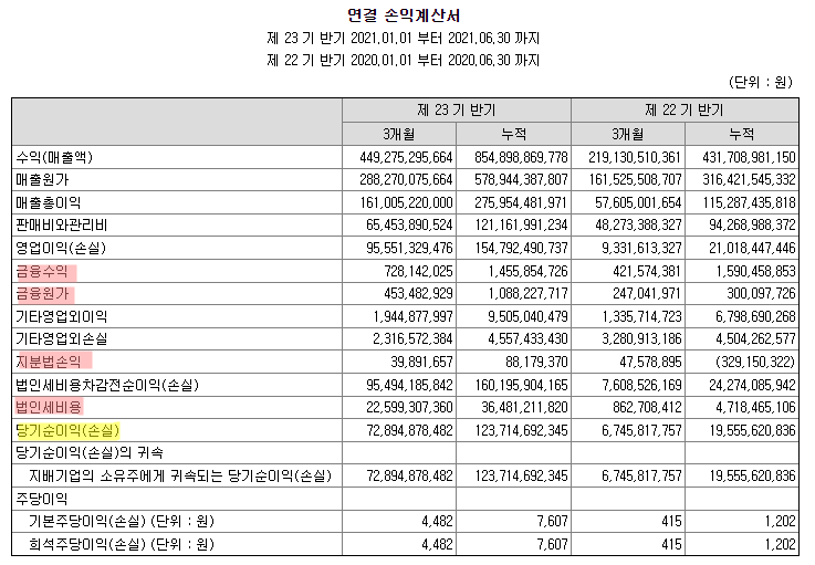 따라서, 지분법손익도 공제해주어야 합니다. 왜냐하면 지분법손익은 영업활동과 직접적 관련이 있는 손익이 아니기 때문입니다. 당기순이익 + 법인세비용 - 금융수익 + 금융원가 - 지분법손익 = 95,179,635,089원이 최종 EBIT가 되겠습니다.