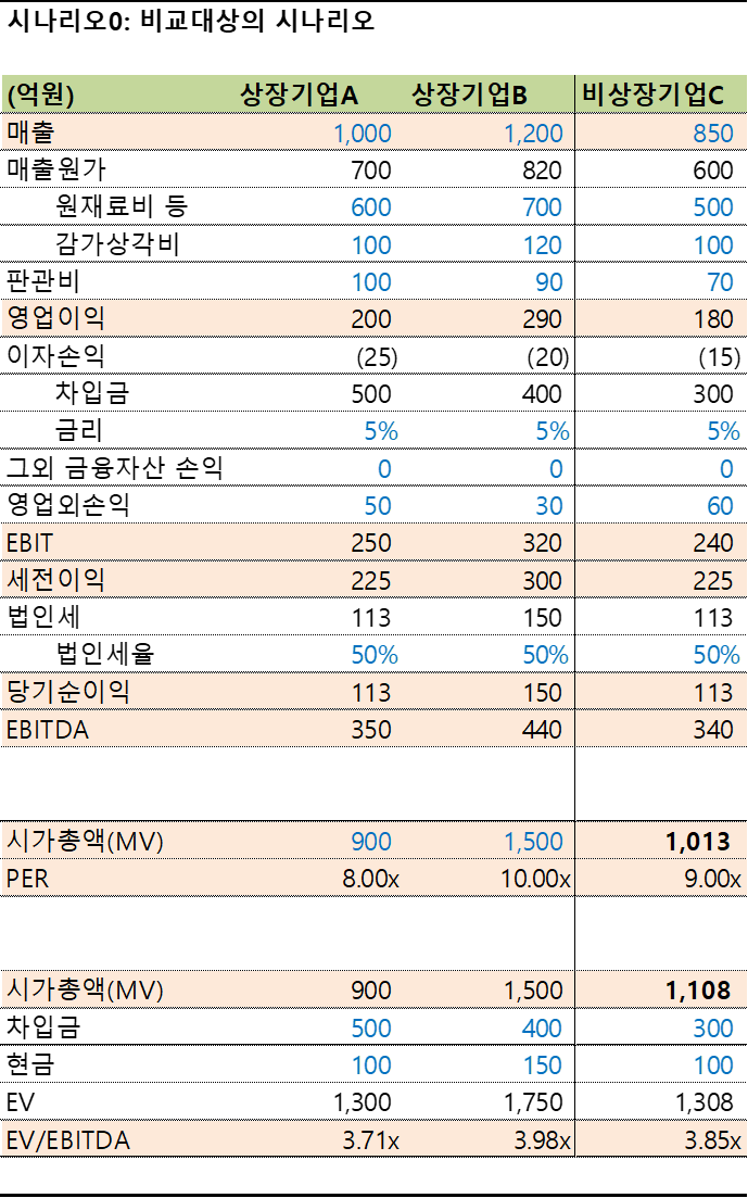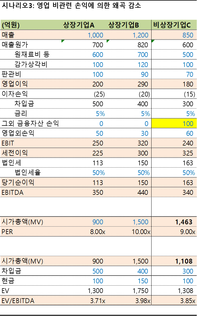 시나리오3에서는 비상장기업C의 그외 이자손익 항목을 조정해보았습니다.비상장기업 C는 본 영업과 관련없는 주식 및 코인 투자를 통해 100억의 수익을 창출했습니다. 그외 금융자산 손익은 영업과는 전혀 관계가 없는 계정으로 정확한 벨류에이션을 위해서는 포함하지 않는 것이 맞습니다.