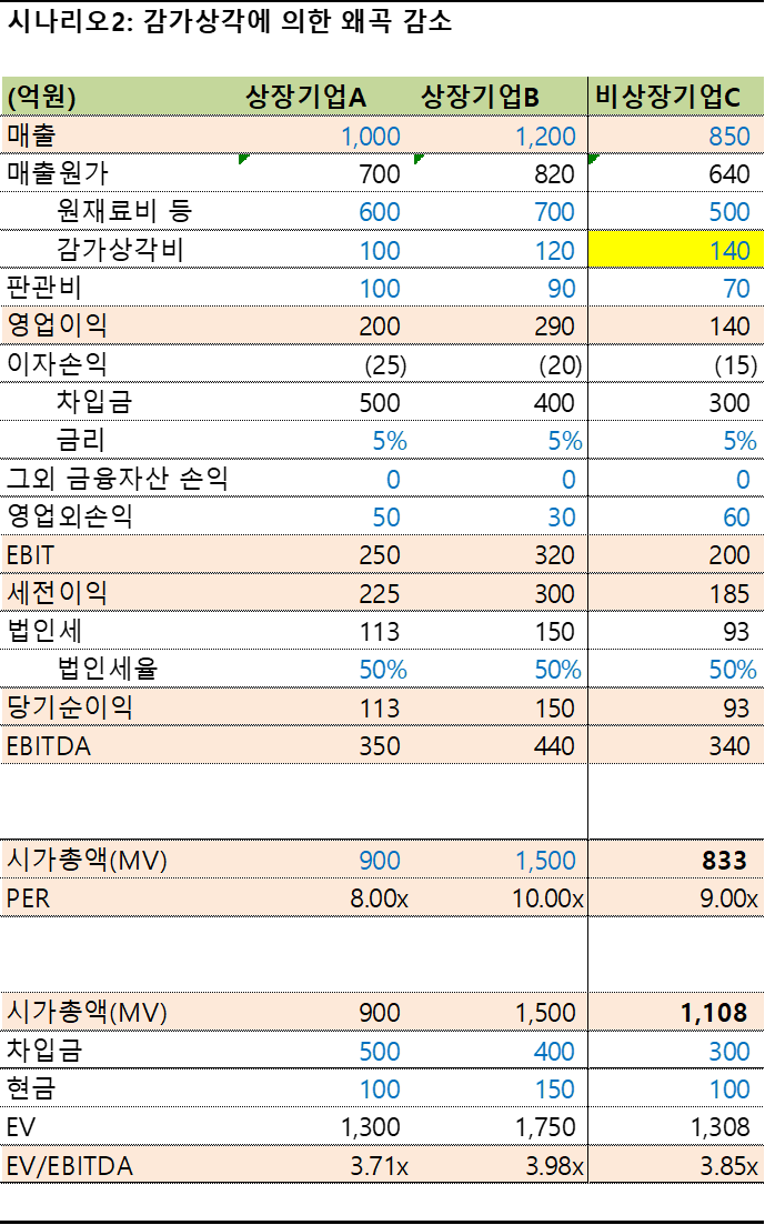 시나리오2에서는 비상장기업C의 감가상각액을 조정해보았습니다.(100억->140억) 감가상각비용이 증가하면, 당기순이익에 영향을 미치므로 PER을 통한 시장가치는 833억으로 기존 시나리오0의 1,013억 대비 17% 큰 폭으로 낮아졌습니다.