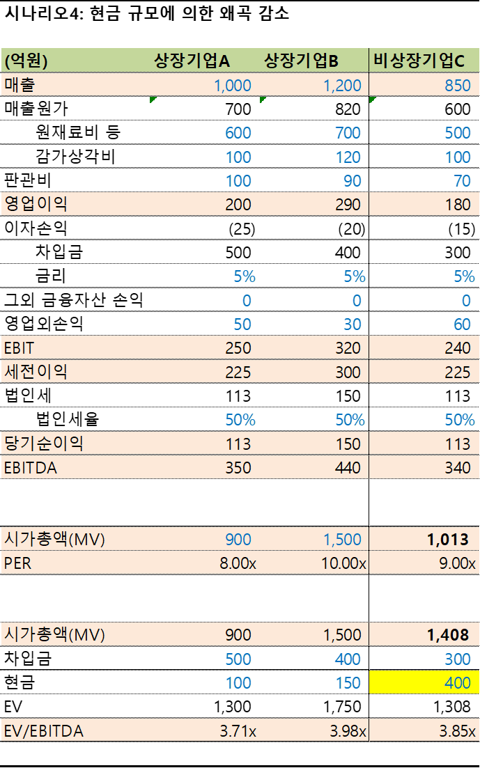 마지막으로 EV/EBITDA는 현금에 의한 가치도 평가에 반영하게 됩니다. 비상장기업 C는 유보자금을 열심히 모아 타 기업대비 현금 보유가 400억으로 매우 높은 축에 속합니다.