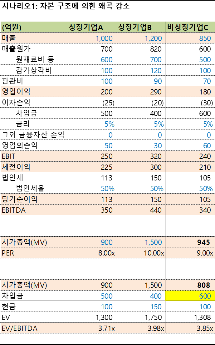 위 테이블을 보시면, 시나리오1에서의 비상장기업C의 차입금은 300억 → 600억으로 증가하여, 이에 따라 금리 5% 가정 시 이자손익이 -15억 → -30억 으로 늘어났습니다.