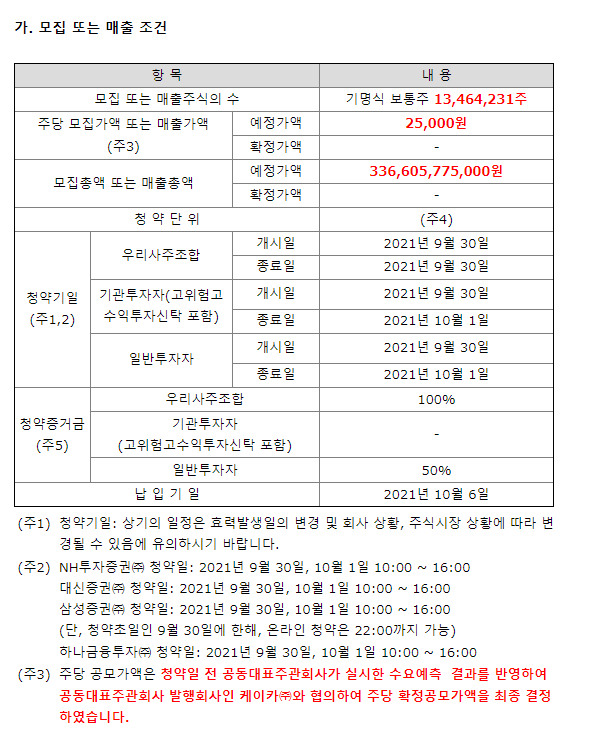 위 스크린샷은 케이카의 투자설명서에서 발췌한 부분이다. 위에 보면 수요예측 신청가격 분포가 있다. 기관들이 가격을 어떻게 써서 냈는지 보여준다. 약371건 참여했고, 25000원을 써낸 비율이 가장 많다. 그래서 아마 공모가를 25000원으로 결정했을 것이다.