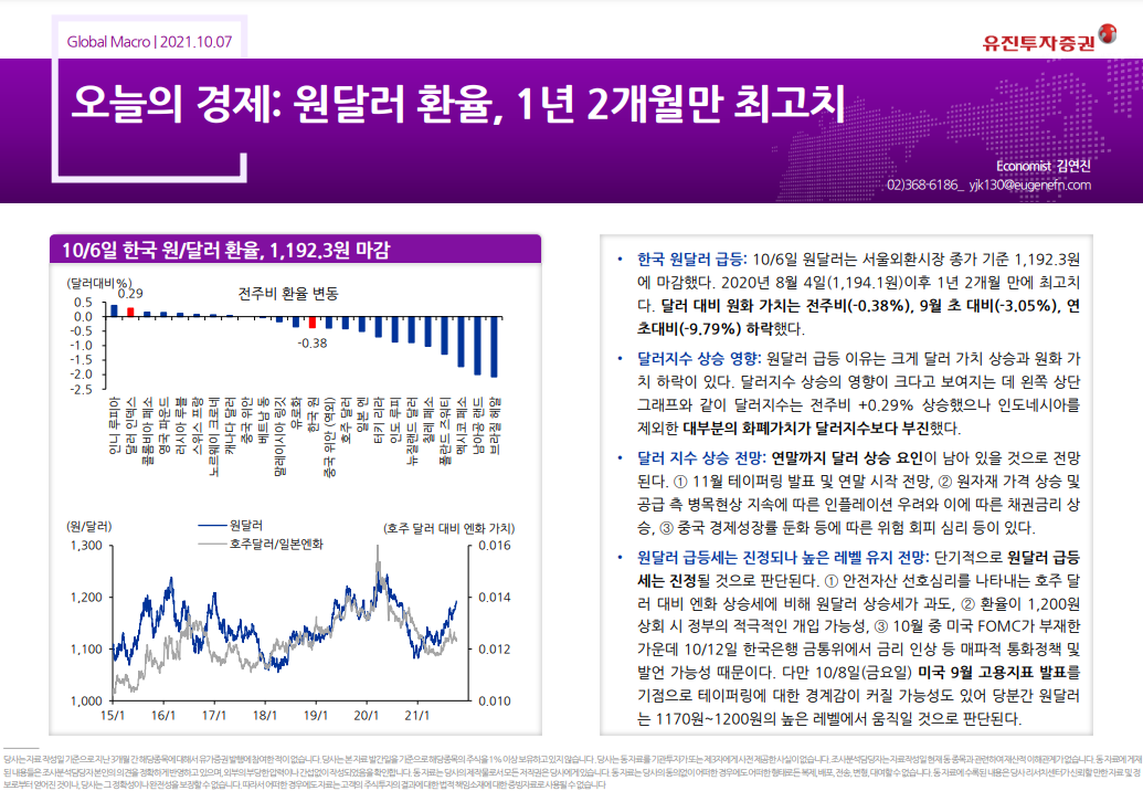 원달러 환율, 1년2개월만에 최고치: 미국 테이퍼링 및 금리상승압박, 중국 위안화 약세로 인한 지역동조화, 원유/천연가스등 원자재 가격 상승에 의한 달러수요증가