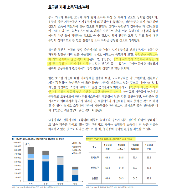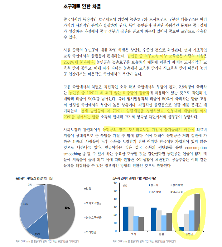 - 농민공: 의료제도, 고용제도 등 정부 지원의 사각지대 -> 농민공 신분에 대한 정부 정책의 변화가 생긴다면 소득과 가처분소득 증가가 발생할 가능성 높음