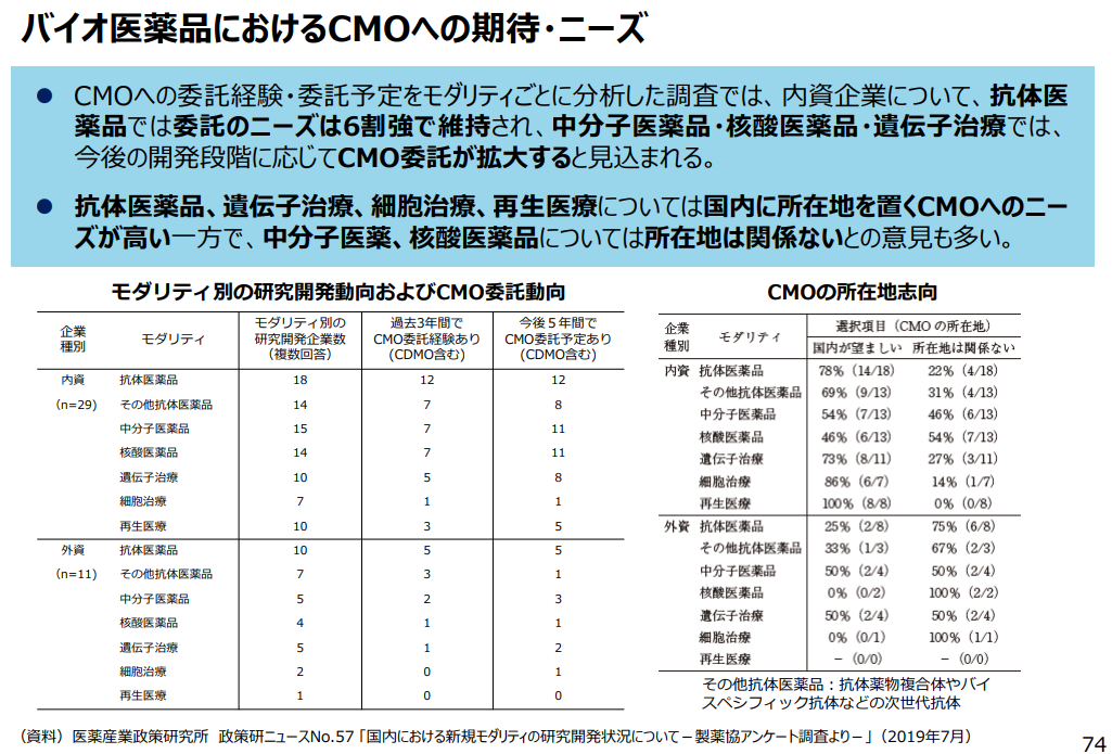 製薬企業の研究開発は低分子医薬品が中心であるが、バイオ医薬品の開発、上市が進展しており、将来的な受託候補品目となる低分子医薬品の新薬上市数が減少する。また、バイオ医薬品は受託可能な企業が限定していることや、国内企業よりも外資系企業が先行しているため、現状ではバイオ医薬品の増加が受託市場の成長に結びつく可能性が低い。