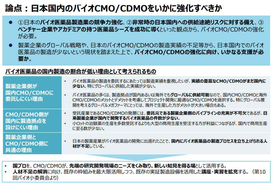 - バイオ医薬品については、今後の市場拡大が期待されるが、低分子化学合成医薬品とは異なり、とくに原薬製造に関しては製造設備の建設に多額な費用が必要とされる他、製造技術などの高度なノウハウが求められる➡高い参入障壁のため市場参入には限界がありそう