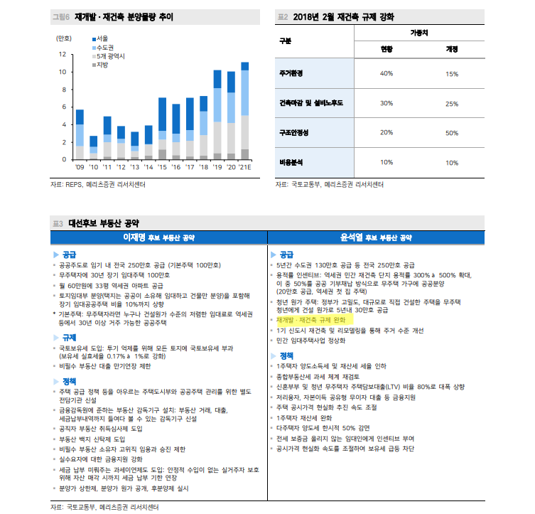 - 이재명, 윤석열 후보 모두 주택 공급확대에는 동의하지만, 그 결이 다름. 이재명 후보는 다주택자에 대한 강력한 규제를 통하여 다주택자 보유 잉여주택을 시장에 공급하게 하는 동시에 공급을 늘이는 방법. 윤석열 후보는 다주택자애 대한 규제를 완화하여 오히려 수요를 증가시키는 동시에 잉여주택을 시장에 공급하게 하는 방법