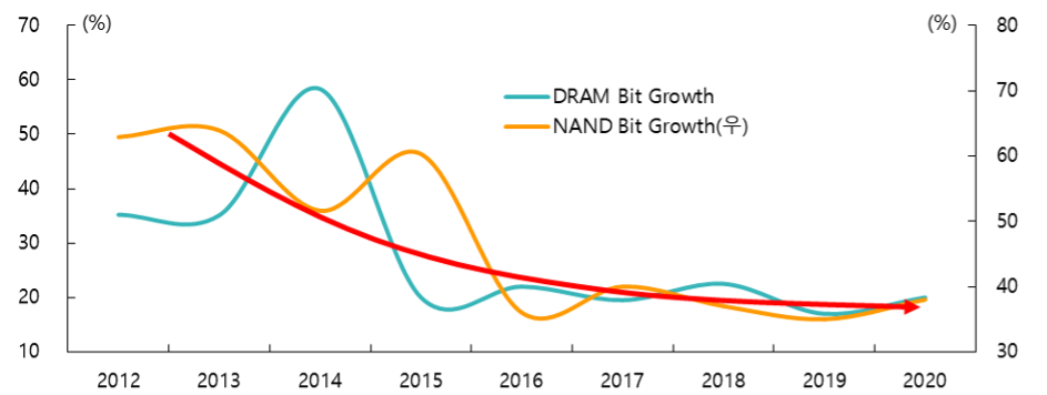 실제 최근까지도 반도체 산업은 호황과 불황이 반복해 나타나고 있지만, 메모리 반도체인 디램의 메모리 수요 증가를 나타내는 비트 그로스(Bit Growth)는 7년째 변동이 거의 없습니다. 수요 부족으로 반도체 불황이 오지는 않는다는 얘기입니다.