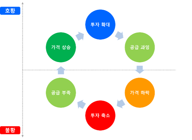 그러나 코로나 사태처럼 예측불가한 이벤트를 제외한다면 인과 관계를 통해 미래를 예측하는 것이 어느 정도는 가능합니다. 반도체 산업의 인과 관계는 아래 도표를 통해 이해할 수 있습니다. 보시는 바와 같이 반도체 산업 사이클은 호황과 불황이 교차로 발생하는 원의 형태입니다. 원 형태의 순환구조를 시계열로 표현하고 현재 위치를 표시하면 자연스레 다음에 오게 될 상황을 알 수 있습니다. 이것이 반도체 시장을 예측하는 기본 구조입니다.