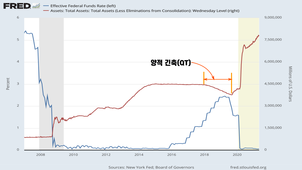 테이퍼링과 비슷한 통화정책으로 양적 긴축(Quantitative Tightening)이란 통화 정책이 있습니다. 비슷하지만 다릅니다. 테이퍼링은 양적완화 규모를 축소하는 것이고 양적 긴축은 양적 완화로 인해 증가된 중앙은행의 자산을 축소하는 것입니다.