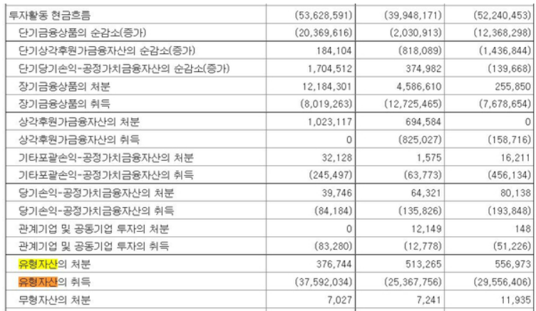 - 현금흐름표: 투자활동 > 유형자산을 취득하기 위한 비용이 모두 반영되어 현금 유출이 발생함