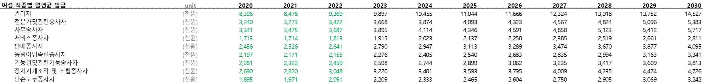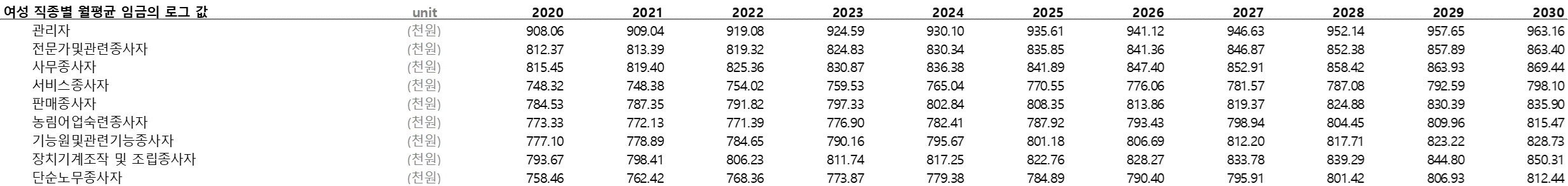 Log함수는 2가지 측면에서 Linear 보다 유용하다. 1. 현실 세계의 한계체감을 잘 반영하고 있다. 아무리 자본을 많이 쏟아부어도 어떤 한계점을 지나면 성장률이 더디다. 로그함수는 한계체감을 잘 표현할 수 있다. 2. 데이터가 편차가 커서 유의미한 모델링이 불가할 때 유용하다. 첫번째 테이블인 "여성 직종별 월평균 임금"에서 관리자와 그외 직종별 임금 편차가 매우 크다. 이때 임금을 독립변수로 사용하면 임금이 낮은 서비스종사자나 단순노무종사자 向 모델링이 심하게 왜곡될 가능성이 있다.