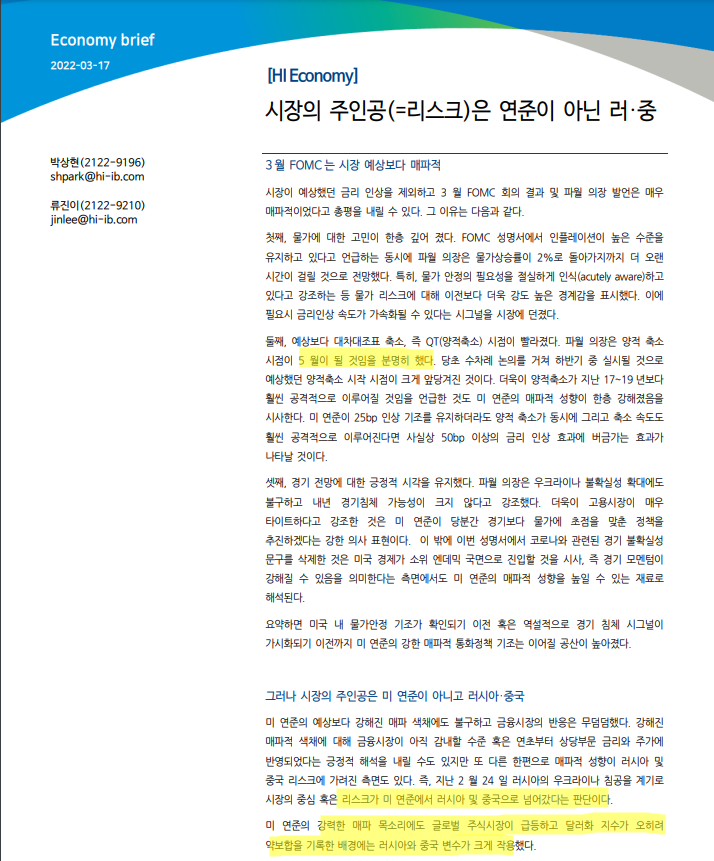 220317_시장의 주인공(=리스크)은 연준이 아닌 러·중: 연준의 양적축소 5월부터 시작될 것