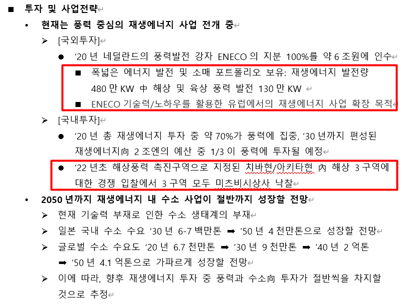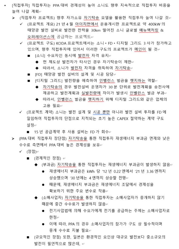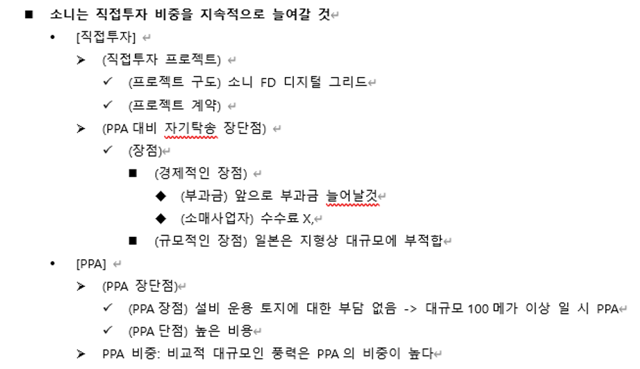 - 하위 레벨의 내용: 재생에너지로 2조원을 확보했다, IT기업들도 직접투자를 하려고 한다.